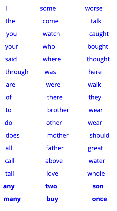 Remember these words cannot be completely sounded out – they must be learnt by sight! The best way to do this is by ‘flashing’ the cards to your child in random order!