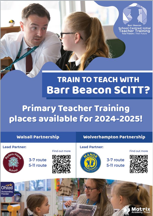 Barr Beacon in partnership with Ryders Hayes School. Here you can train to do a School Centred Initial Teacher Training (SCITT). For more information scan the QR code below. Alternatively you can visit BBSCITT.